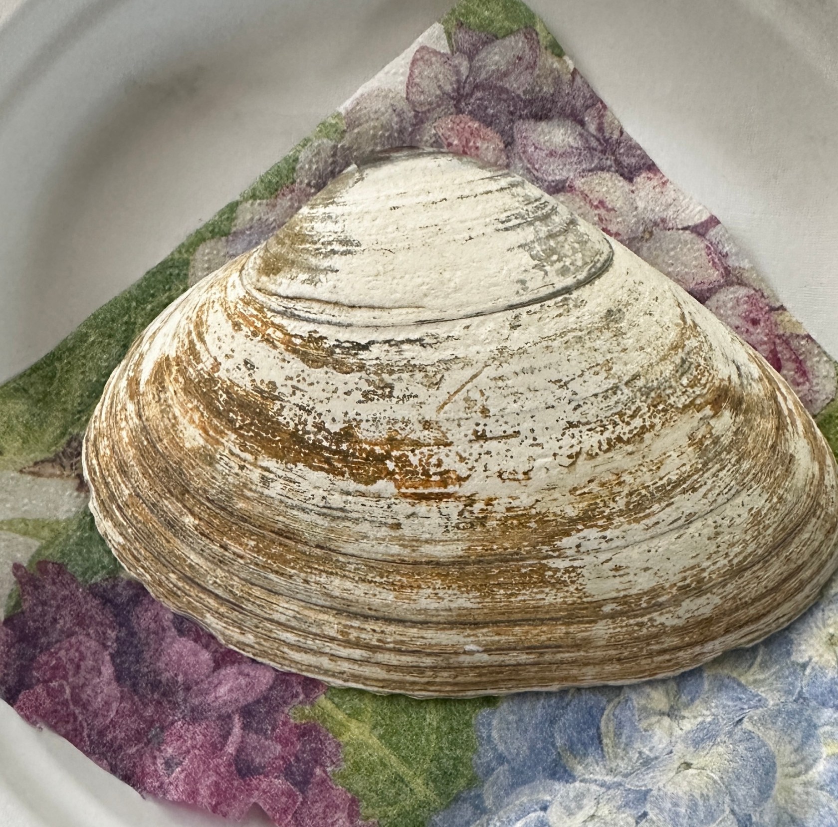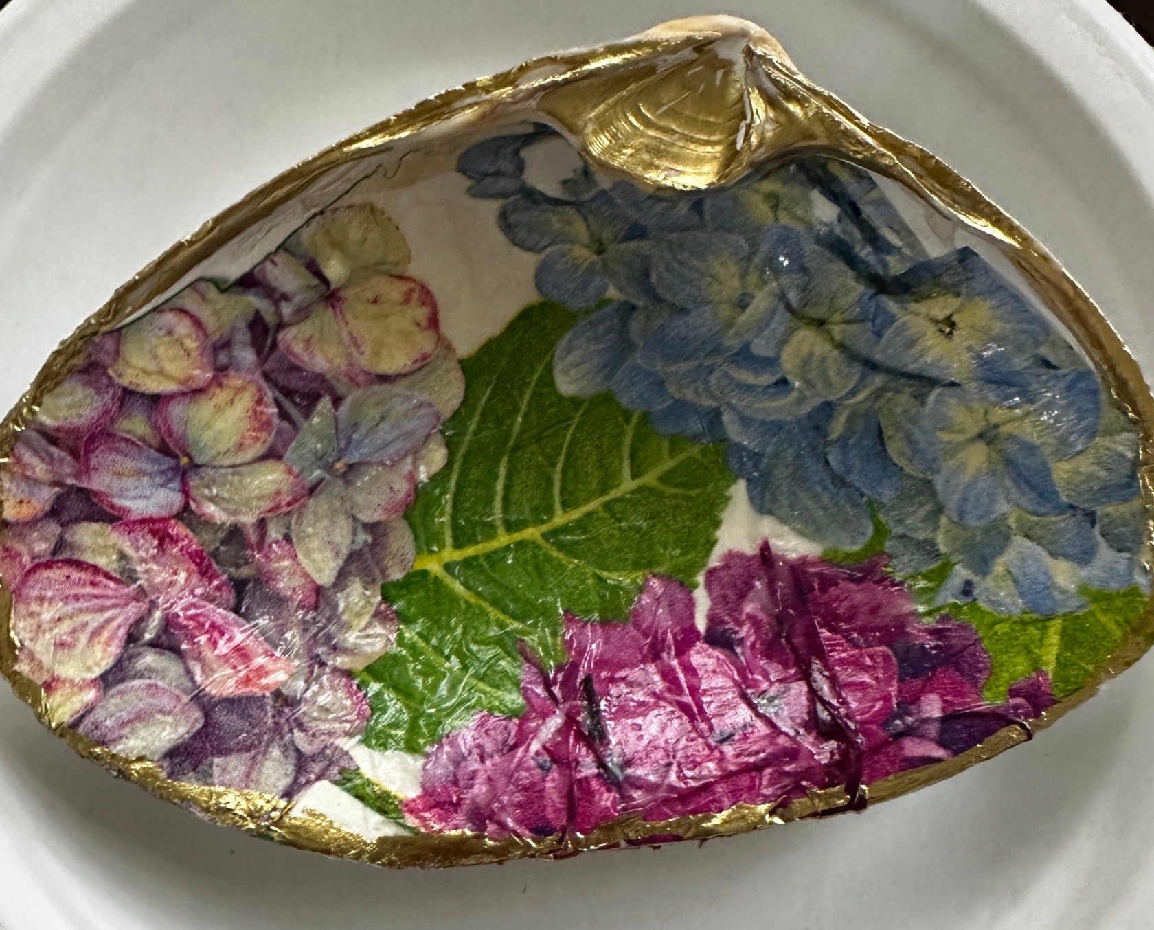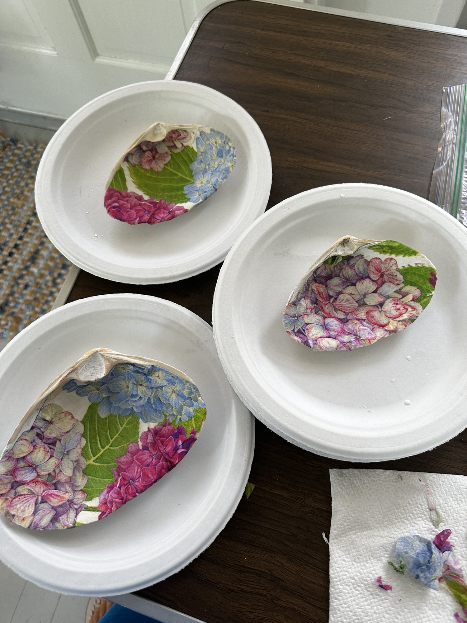 I had some leftover cocktail napkins from an event and decided to give it a whirl. Caspari Hydrangea Napkins One can use any shell you want – oyster, scallop, mussel, but I did surf clams.
